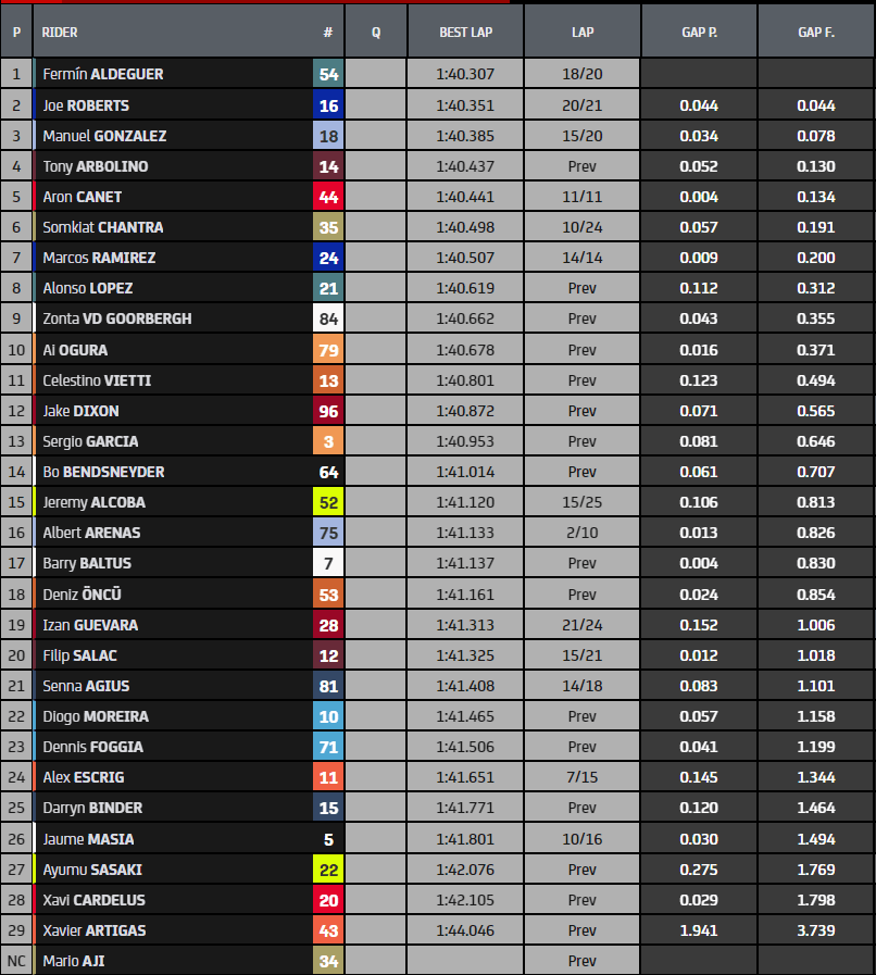 El último día de test no fue tan bueno como los anteriores para el valenciano, Arón Canet (Fanatic Racing), que aunque llegaba a superar su mejor tiempo, en esta categoría y en esta misma pista (1.40.640), consiguiendo rascar esa décima que le hacía falta con un crono de 1:40.441; no le fue suficiente para imponerse ante un Fermín Aldeguer, que avisaba desde un discreto tercer puesto, en el día anterior y  con un tiempo de 1.40.884, lograba arrebatar 5 décimas al crono, dejándolo parado en 1.40.307. Canet quedaba en quinta posición, mientras que Joe Roberts (Kalex) superó su registro con un 1.40.351, subiendo el escalón y obteniendo la segunda plaza.