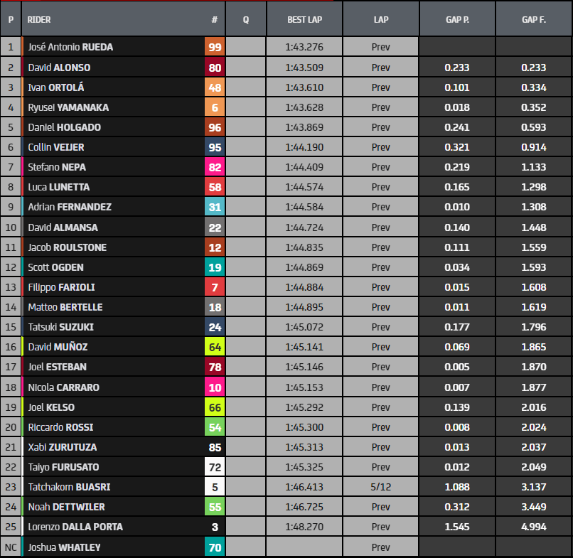 José Antonio Rueda (Red Bull KTM Ajo) ha sido el protagonista de hoy en este último día de pruebas. El piloto sevillano ha liderado la combinada, cuestionando el liderazgo del joven David Alonso que ha imperado durante todos los días de test. El andaluz se sacaba de la chistera un crono de 1.43.272 (dos segundos más rápido que el récord de vuelta de Andrea Migno) para llegar a la primera posición. Detrás de él quedaba David Alonso. Tras ellos, se acercaban los pilotos del MT Helmets-MSI, Iván Ortolá y Ryusei Yamanaka a 4 décimas de Rueda.