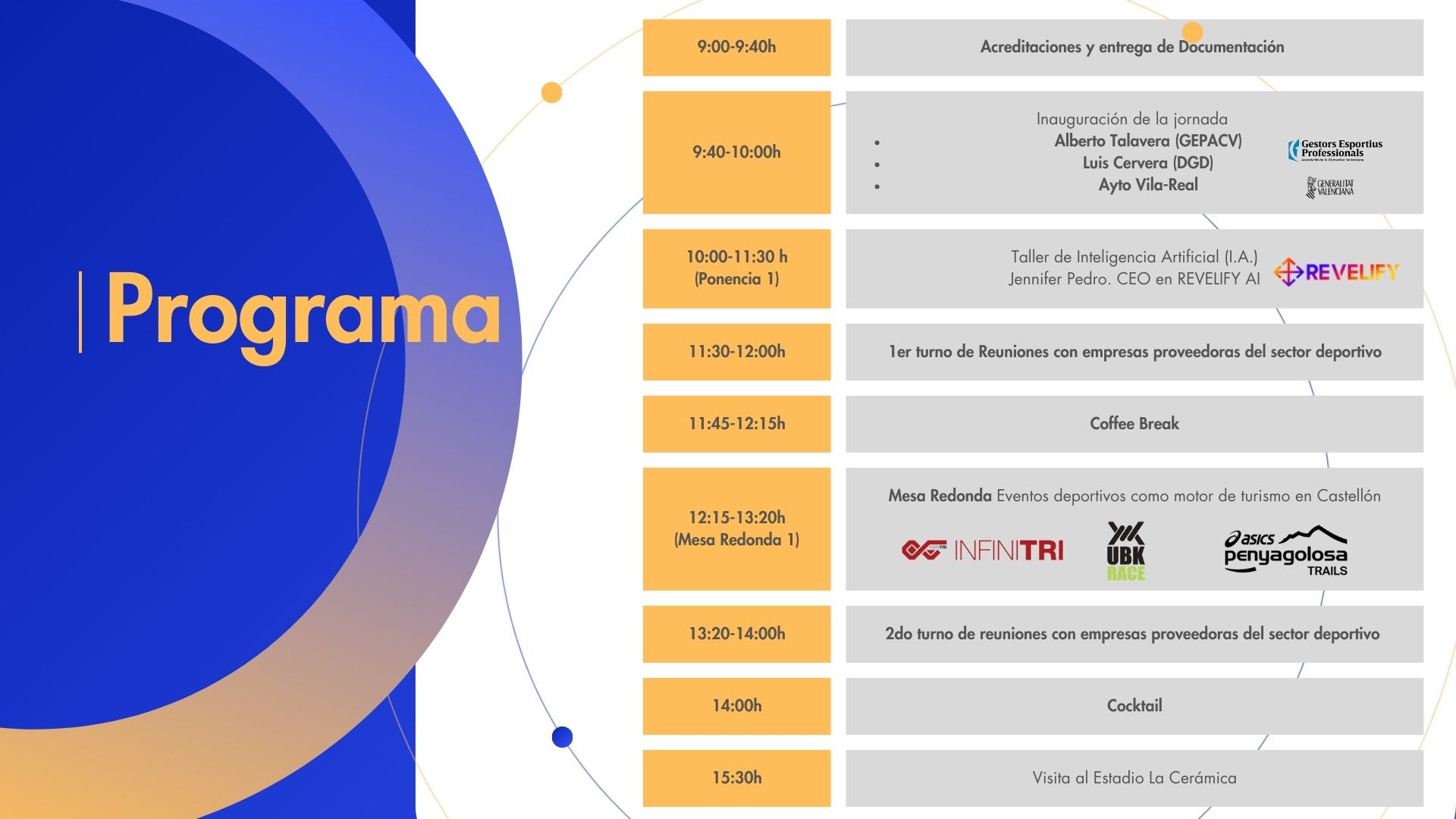 Entre los contenidos más destacados se encuentra un taller sobre aplicaciones prácticas de la I.A., impartido por Jennifer Pedro, CEO de REVELIFY AI, y una mesa redonda que pondrá el foco en el papel de los eventos deportivos como generadores de dinamismo turístico en la provincia de Castellón.